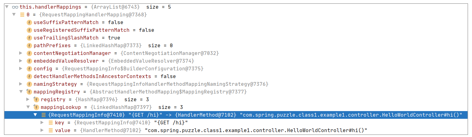 寻找方法参考DispatcherServlet#getHandler,具体的查找远比开始给出的Map查找来得复杂,但是无非还是一个根据请求寻找候选执行方法的过程,这里我们可以通过一个调试视图感受下这种对应关系: