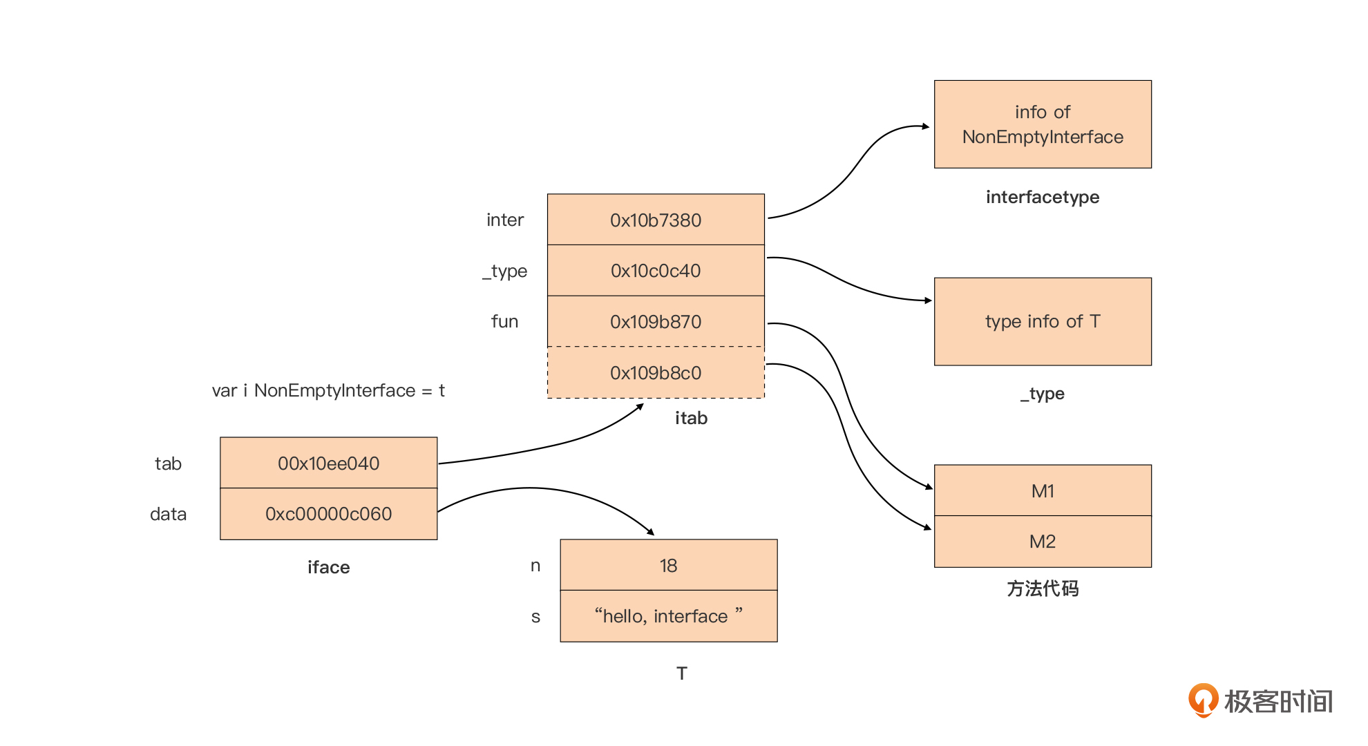 而iface除了要存储动态类型信息之外,还要存储接口本身的信息(接口的类型信息、方法列表信息等)以及动态类型所实现的方法的信息,因此iface的第一个字段指向一个itab类型结构。itab结构的定义如下: