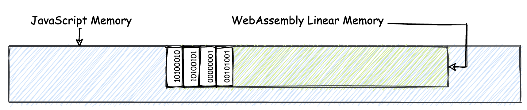 除了调用栈,每一个实例化的 Wasm 模块对象都有着自己的(在 MVP 下只能有一个)线性内存段。在这个内存段中,以二进制形式存放着 Wasm 模块可以使用的所有数据资源。