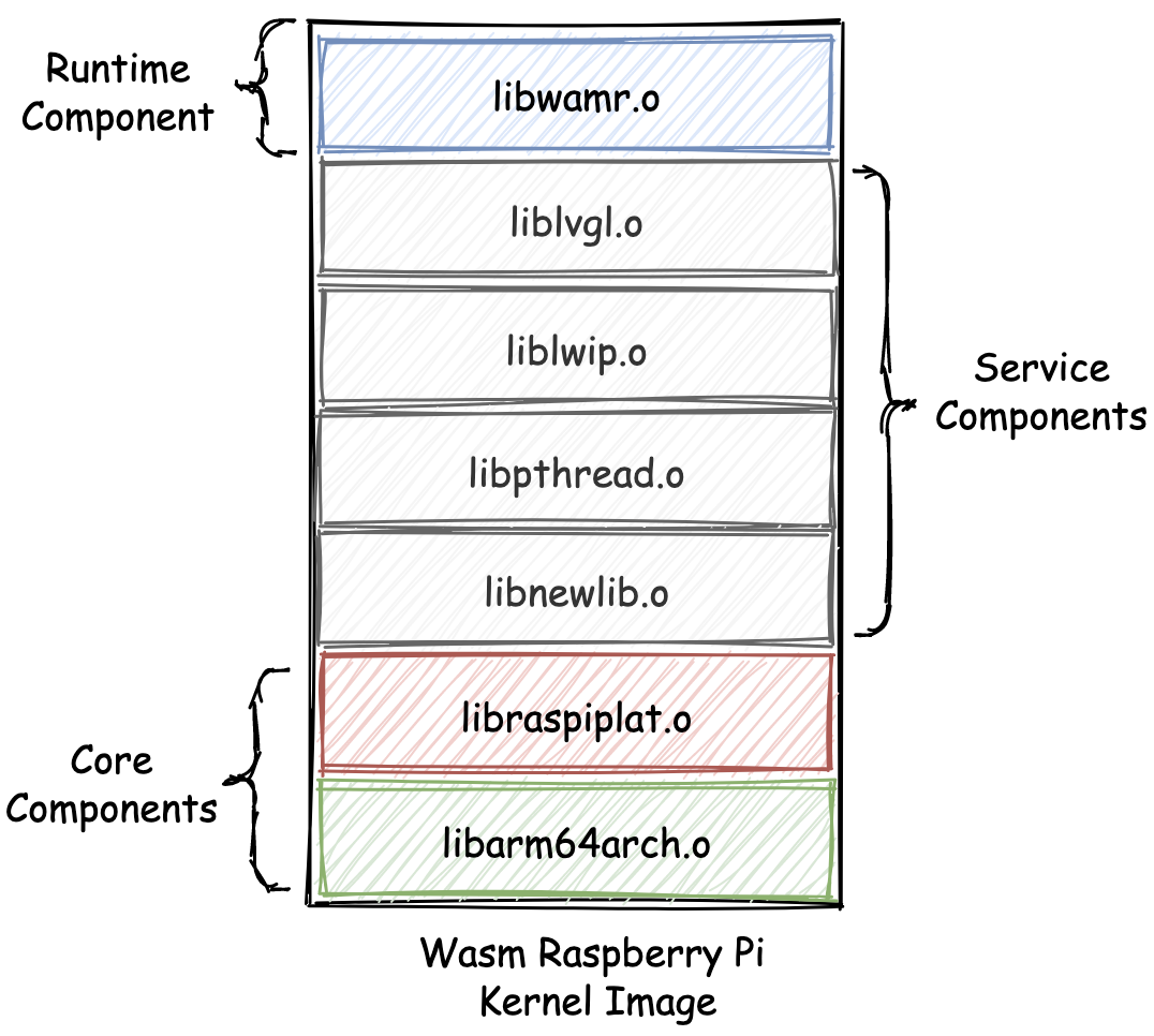 比如我们可以为“树莓派(一种嵌入式开发板)”,构建一个拥有如下“服务栈”的 Wasm 微内核。在这个微内核中,除了最下层必要的内核组件以外,我们还为其添加了用于支持“图形界面”、“多线程”、“网络通信”以及“C 标准库”等功能的必要组件。