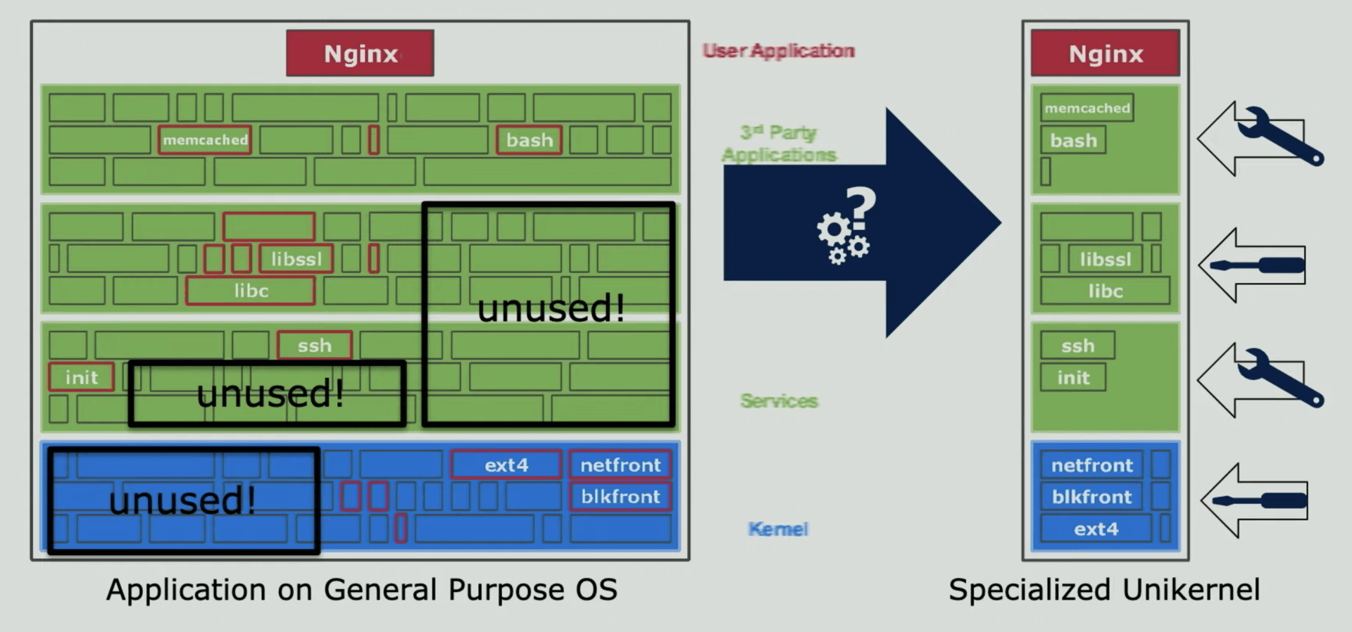 如下图左侧所示,在传统的操作系统内核架构中,有着用来支持各类功能的底层驱动、框架、接口以及组件库。实际上对于具有某一特定功能的嵌入式设备来说,其中的大部分内核底层功能都没有存在的必要性,但却仍然占用着一部分的硬件资源。
