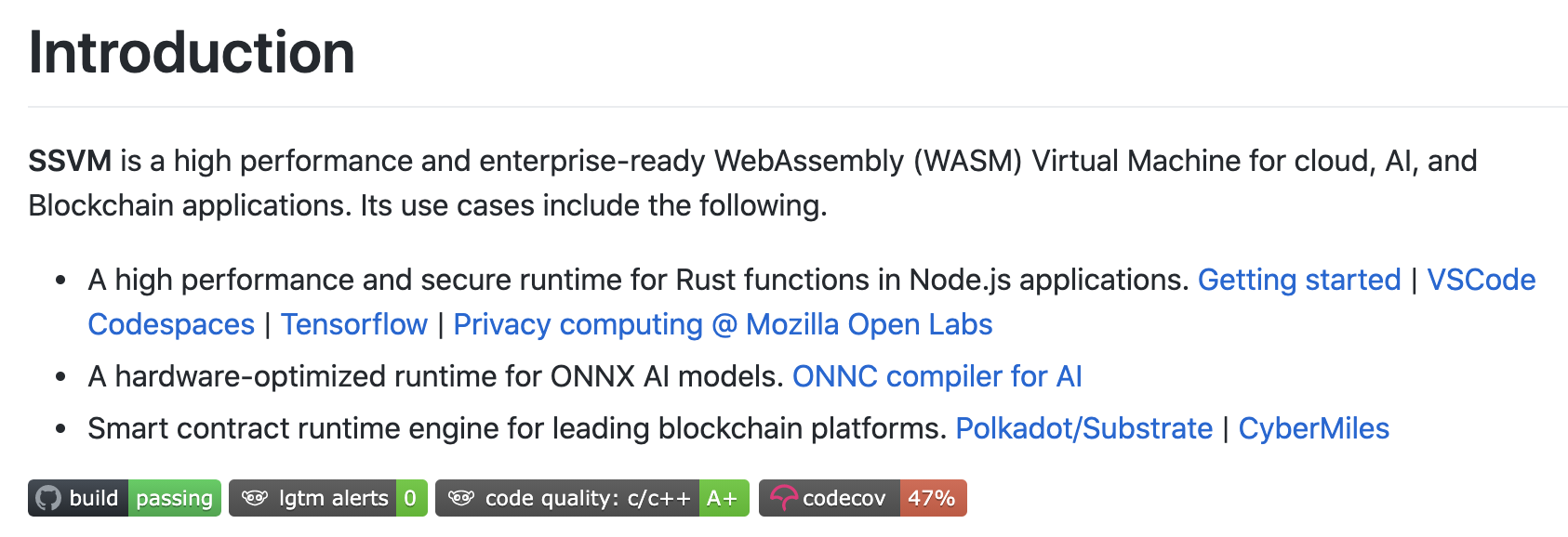 最后一个要介绍的 Wasm 运行时是 SSVM。它是一个专门针对云、AI 以及区块链应用程序设计的高性能、可扩展且经过硬件优化的 Wasm 虚拟机。