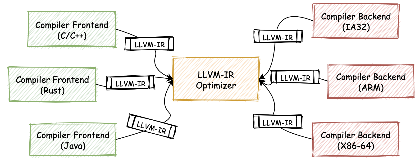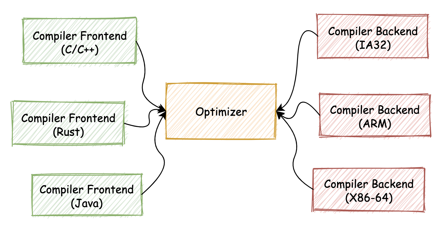 然而一个现实的情况是,实际上在 LLVM 出现之前,在各类编程语言的编译器链路中,并没有采用完全统一的中间产物表示形式(包括 IR、AST 等在内)。因此如果想要对编译器链路中的某一部分进行重用,这个过程仍然会十分困难。