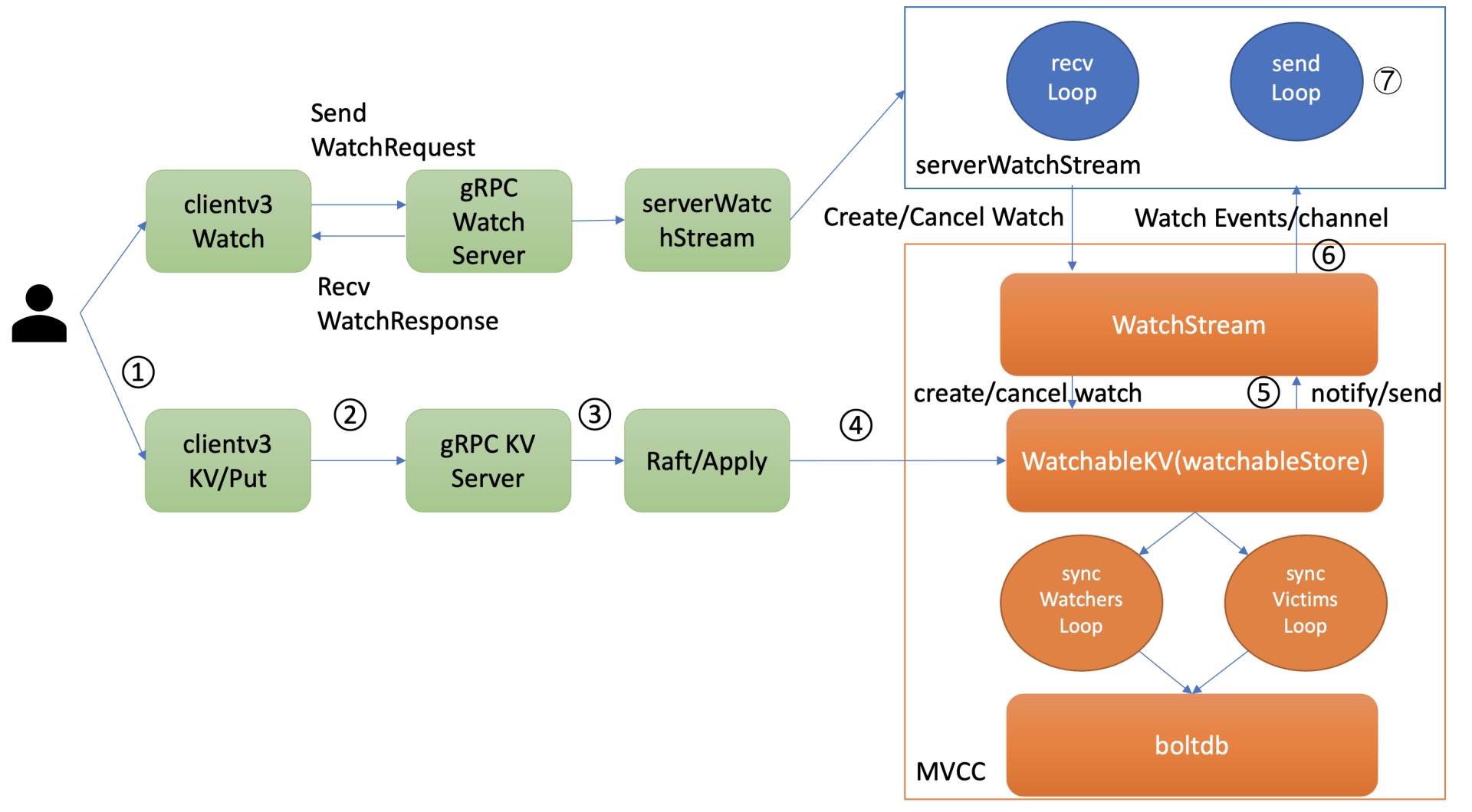 serverWatchStream的sendLoop goroutine监听到channel消息后,读出消息立即推送给client(流程6和7),至此,完成一个最新修改事件推送。