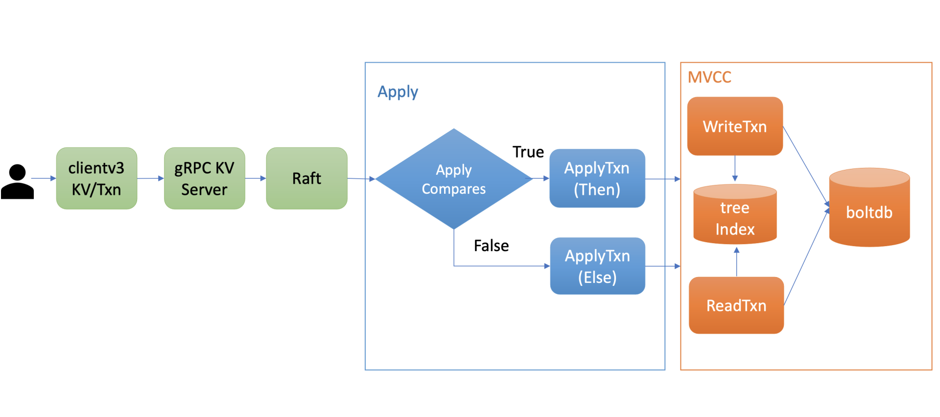 上图是etcd事务的执行流程,当你通过client发起一个txn转账事务操作时,通过gRPC KV Server、Raft模块处理后,在Apply模块执行此事务的时候,它首先对你的事务的If语句进行检查,也就是ApplyCompares操作,如果通过此操作,则执行ApplyTxn/Then语句,否则执行ApplyTxn/Else语句。