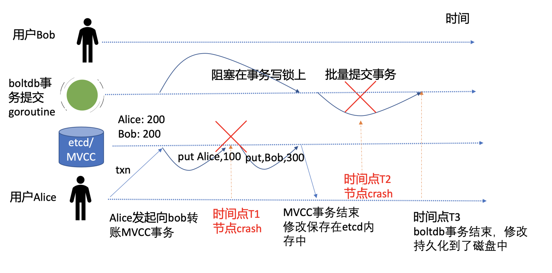 T2时间点是在MVCC写事务完成转账,server返回给client转账成功后,boltdb的事务提交goroutine,批量将事务持久化到磁盘中时发生了crash。这时etcd又是如何保证原子性和持久性的呢?