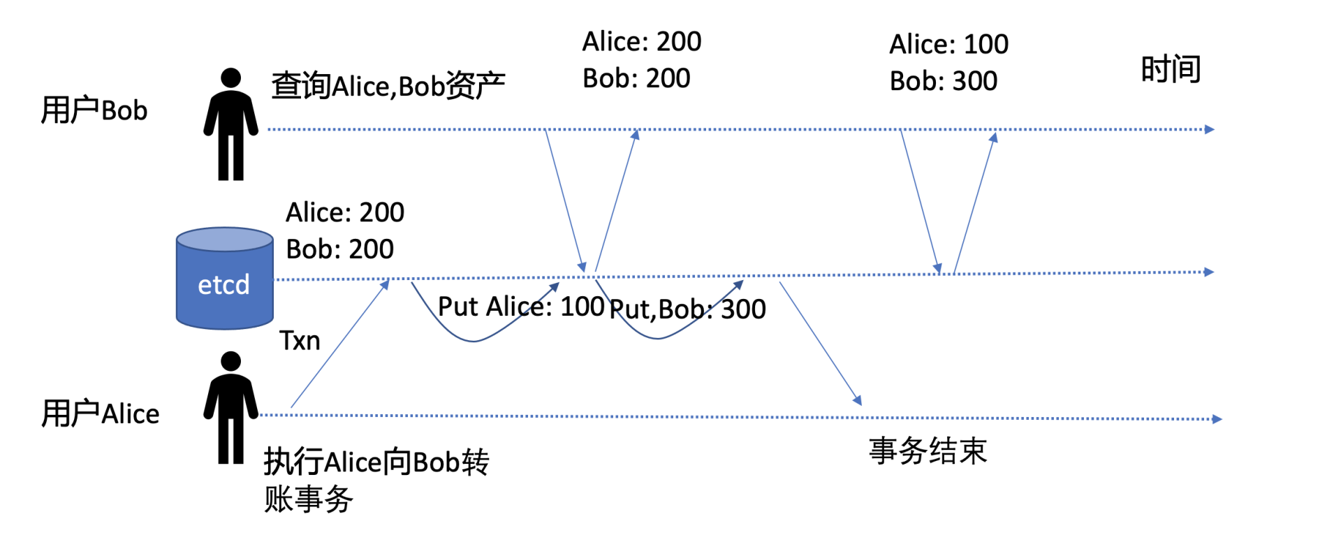 图中有两个事务,一个是用户查询Alice和Bob资产的事务,一个是我们执行Alice向Bob转账的事务。