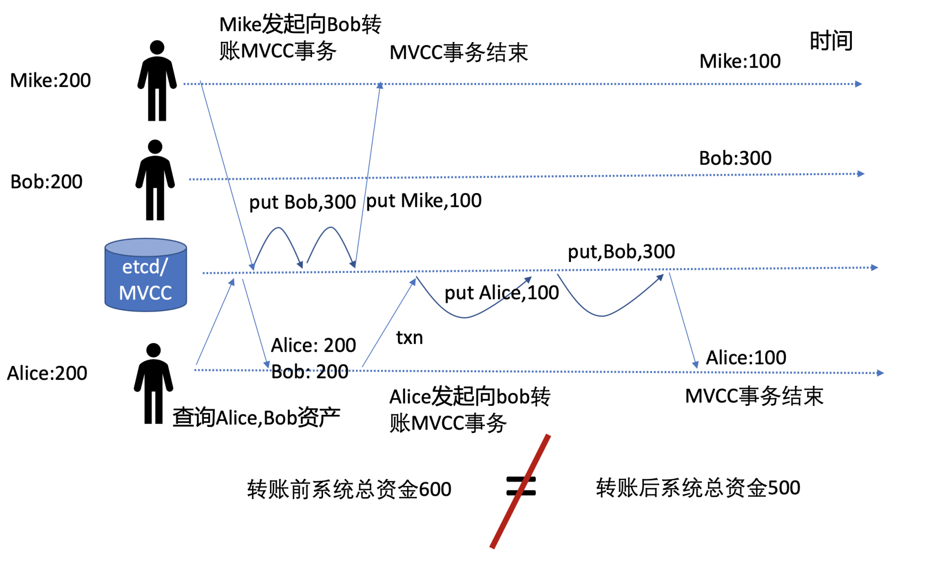 一开始时,Mike的版本号(指mod_revision)是4,Bob版本号是3,Alice版本号是2,资产各自200。为了防止并发写事务冲突,etcd在一个写事务开始时,会独占一个MVCC读写锁。