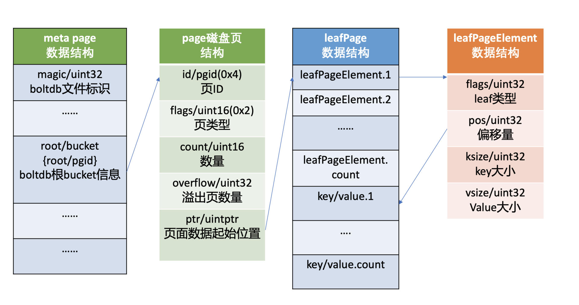 leafPageElement包含leaf page的类型flags, 通过它可以区分存储的是bucket名称还是key-value数据。