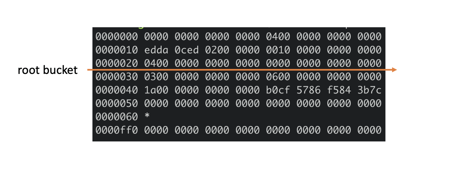 第三行对应的就是meta page的root bucket结构(16个字节),它描述了boltdb的root bucket信息,比如一个db中有哪些bucket, bucket里面的数据存储在哪里。