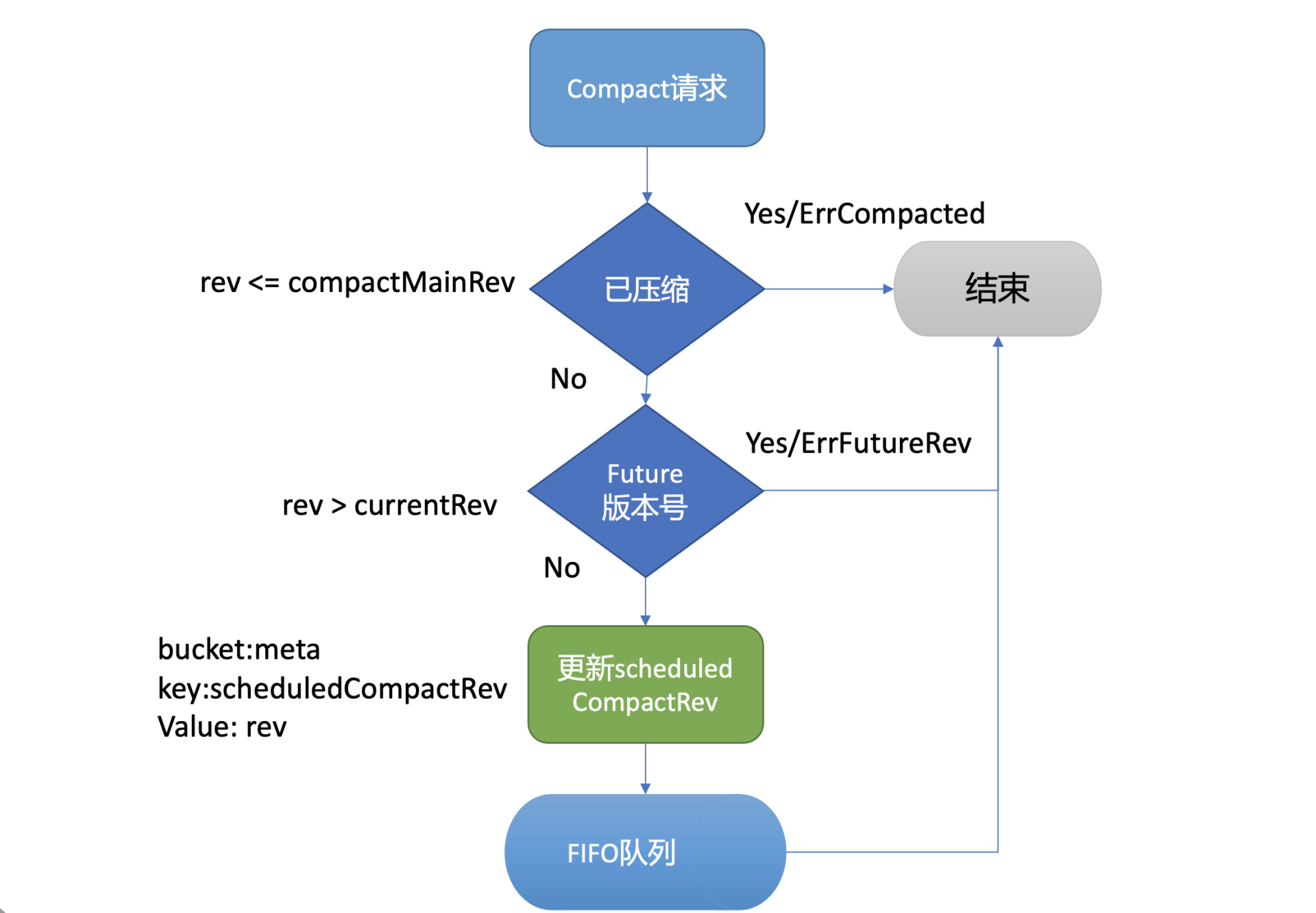 通过检查后,Compact接口会通过boltdb的API在meta bucket中更新当前已调度的压缩版本号(scheduledCompactedRev)号,然后将压缩任务追加到FIFO Scheduled中,异步调度执行。