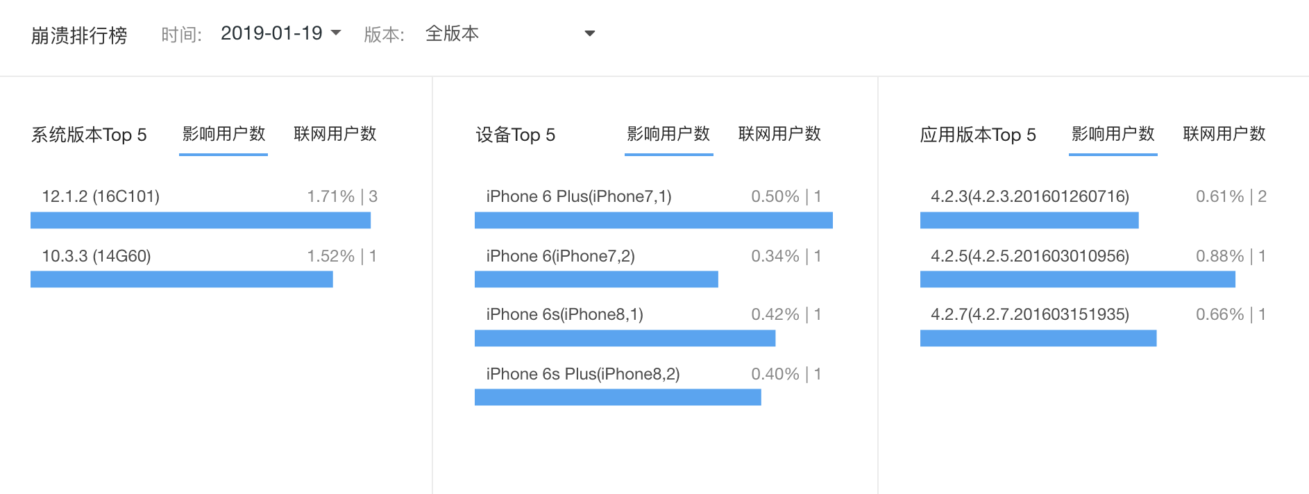除了崩溃率,你还可以在这个平台上能查看次数、用户数等趋势。下图展示的是某一个App的崩溃在不同 iOS 系统、不同iPhone 设备、App 版本的占比情况。这也是全局大盘观察,从不同维度来分析。