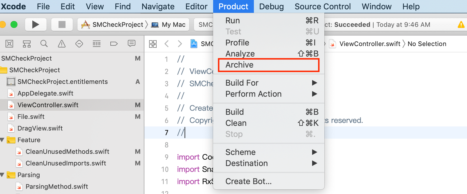 收集崩溃日志最简单的方法,就是打开 Xcode 的菜单选择 Product -> Archive。如下图所示: