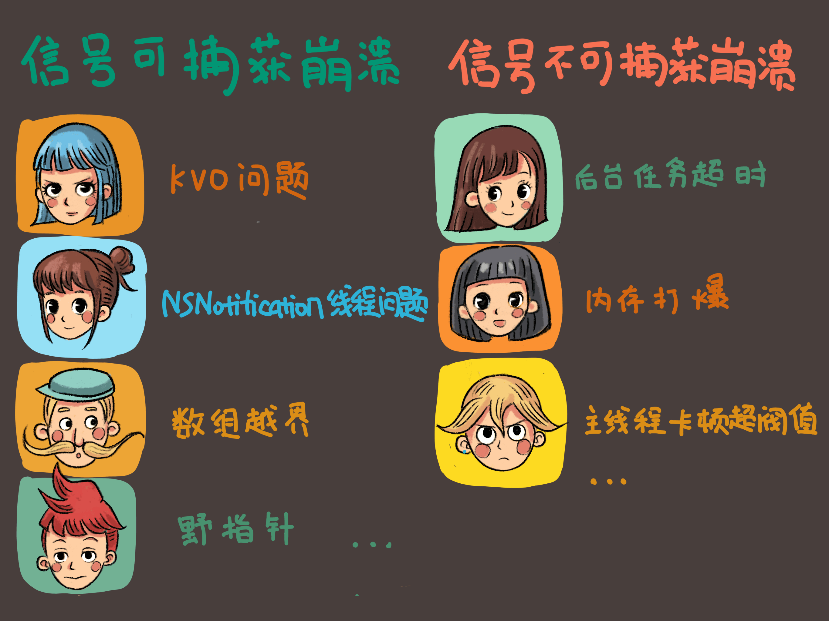 通过这张图片,我们可以看到, KVO问题、NSNotification 线程问题、数组越界、野指针等崩溃信息,是可以通过信号捕获的。但是,像后台任务超时、内存被打爆、主线程卡顿超阈值等信息,是无法通过信号捕捉到的。