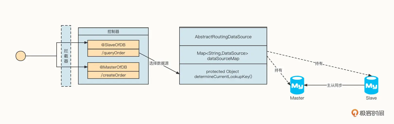 第二,当用户发起请求时,要先经过一个拦截器获取用户请求的具体接口,然后使用反射机制获取该方法上的注解。举个例子,如果存在 @SlaveofDB,则往线程上下文环境中存储一个名为 dbType 的变量,赋值为 slave,表示走从库;如果存在 @MasterOfDB,则存储为 master,表示走主库。