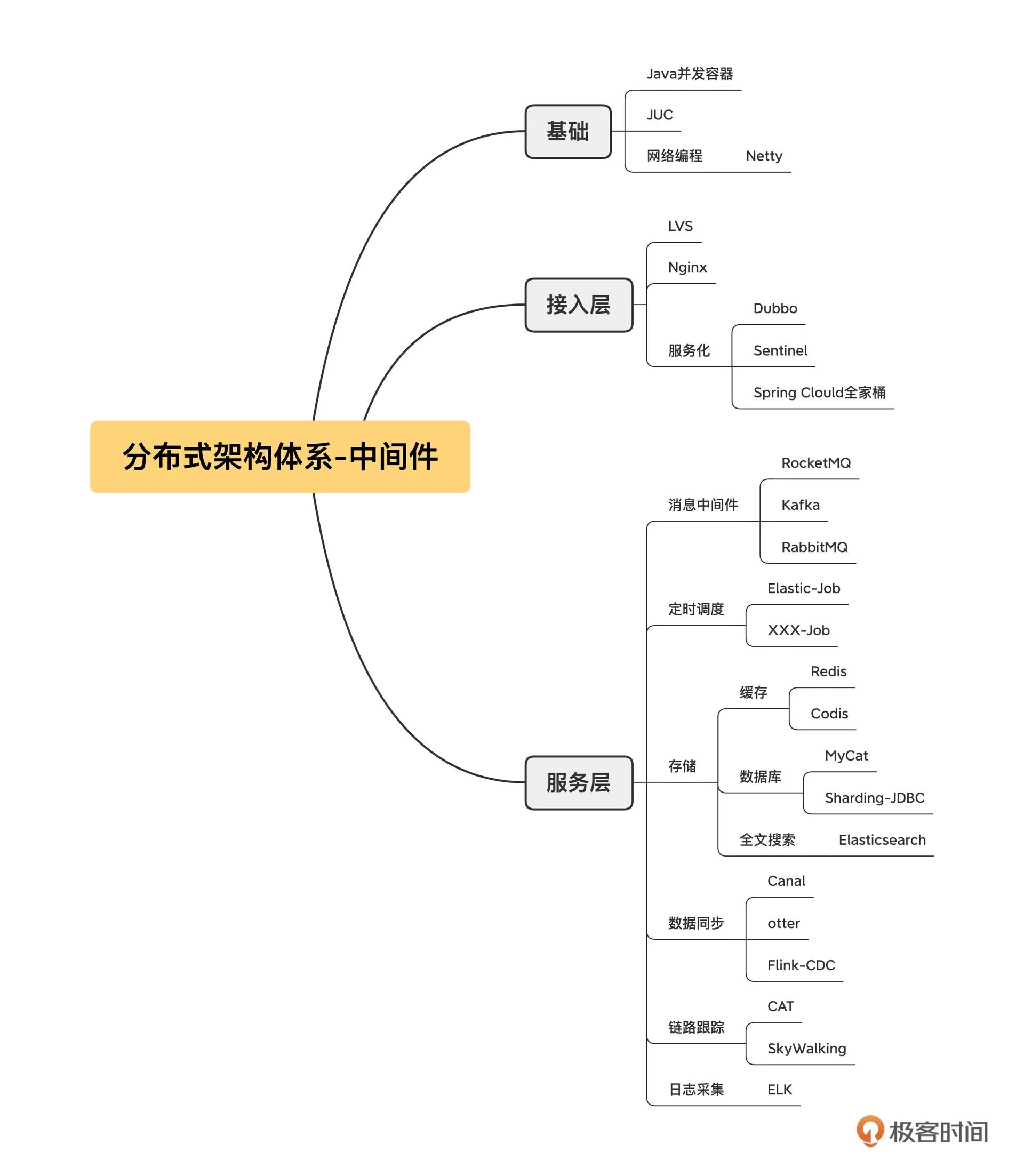 明白了中间件的内涵,我们再来看看市面上有哪些中间件。我在开篇词中已经提到过了,中间件的种类繁多,我整理了一版分布式架构体系中常见的中间件,你可以先打开图片仔细看一看。