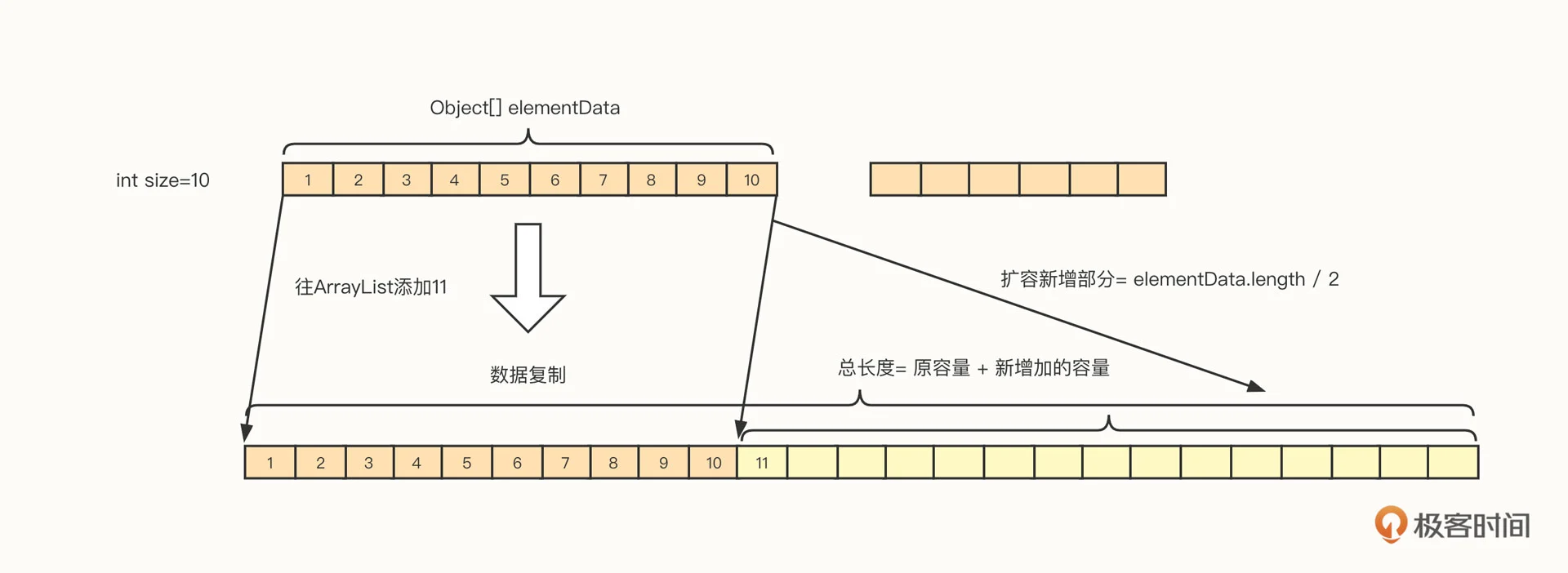 首先我们来看一下 ArrayList 的底层存储结构,你可以先看下这个示意图: