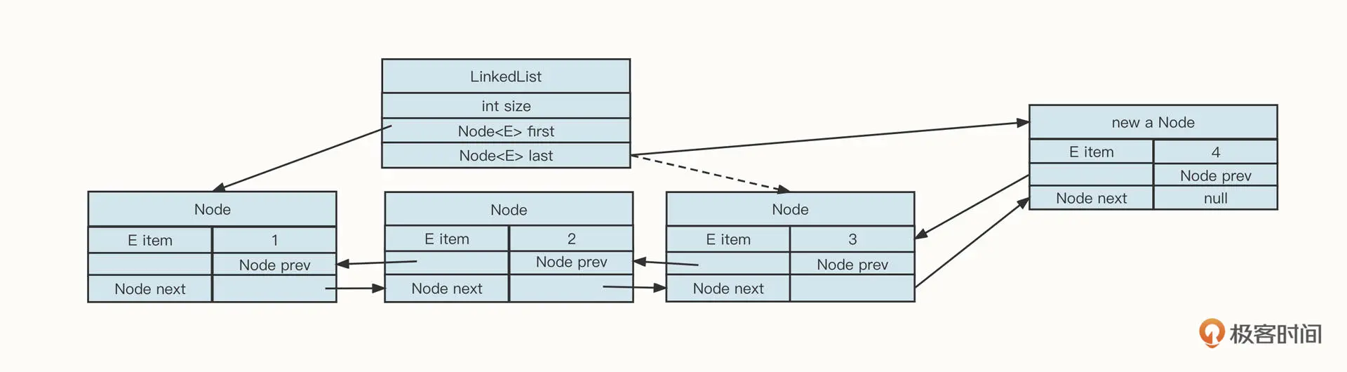 list.last = newNode; // 更新LinkedList的尾部节点为新添加节点