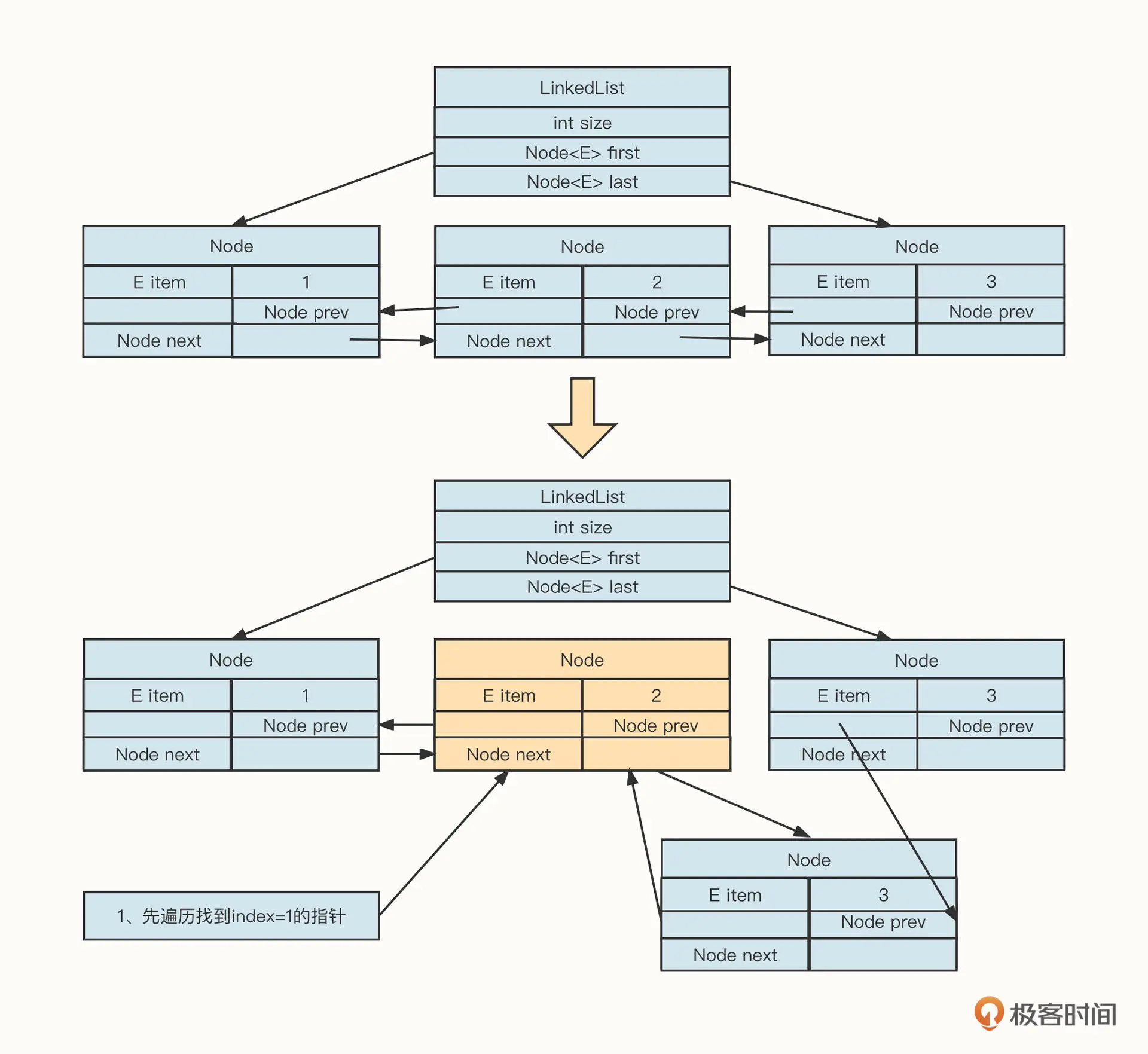 从上面这张图你可以看到,一个 LinkedList 对象在内存中通常由两部分组成:LinkedList 对象和由 Node 节点组成的链条。