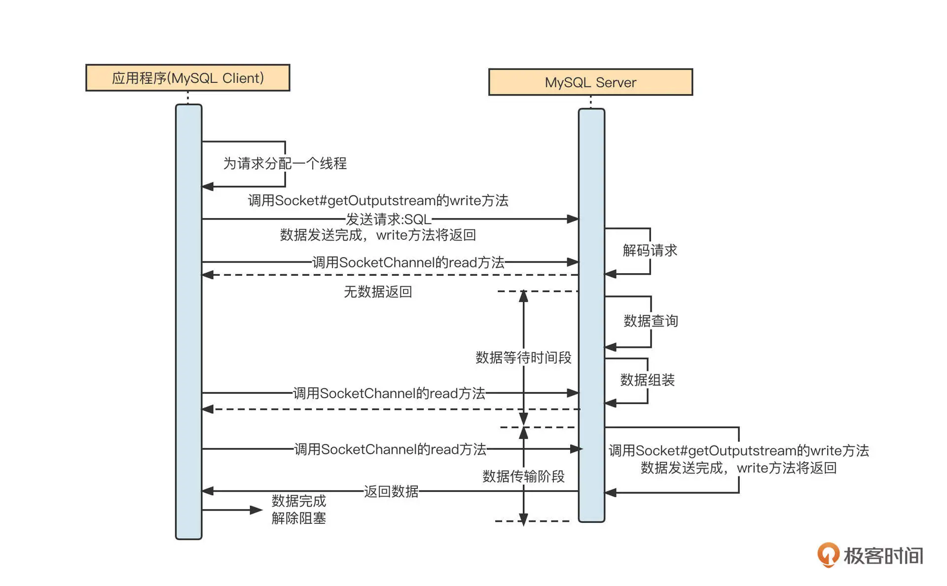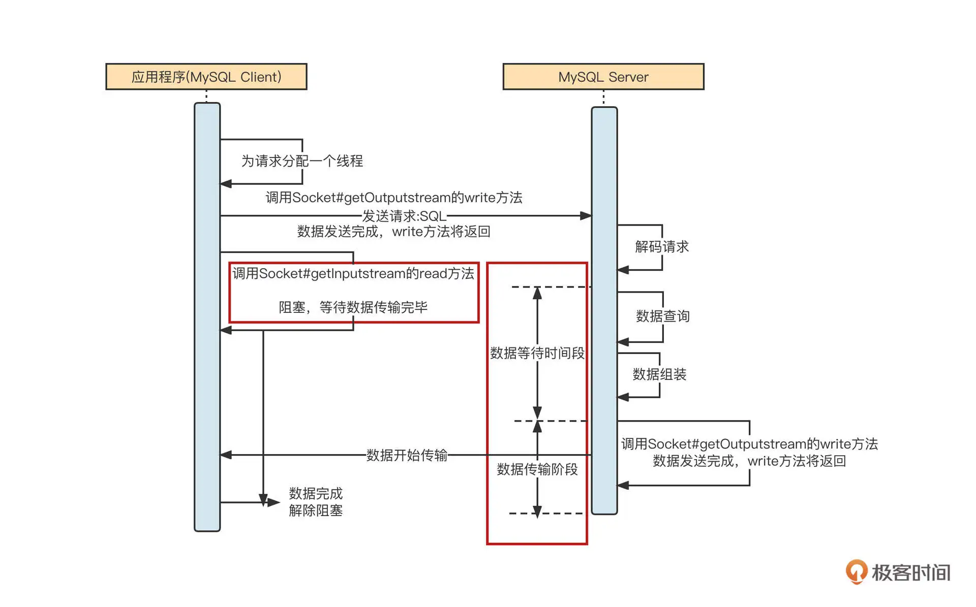 第三步,服务端在收到请求后会解析请求,从请求中提取出对应的 SQL 语句,然后按照 SQL 抽取数据。服务端在处理这些业务逻辑时,客户端阻塞,不能做其他事情,我把这个阶段称之为等待数据阶段。