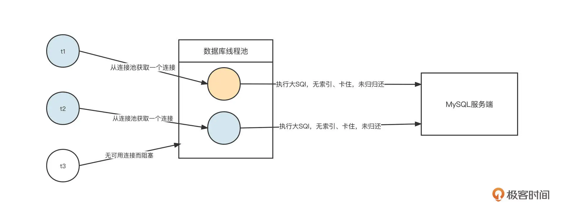 简单说明一下。假设业务代码存在缺陷,导致需要执行一条 SQL 语句来获取大量数据。这时,我们要尝试从数据库连接池中获取连接,并通过这个连接向 MySQL 服务端发送 SQL 语句。由于这条 SQL 语句的执行性能很差,这条连接在客户端一直被阻塞,无法继续发送更多的 SQL。另外如果数据库连接池中没有空闲连接,再尝试获取连接时还需要等待连接被释放,服务器缓慢的执行速度确保了客户端不能持续发送新的请求,对保护数据库服务器大有裨益。