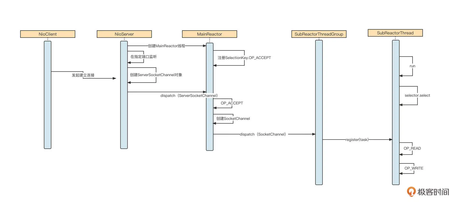 我们先来看一下 Reactor 模型的时序图,从全局把握整体脉络: