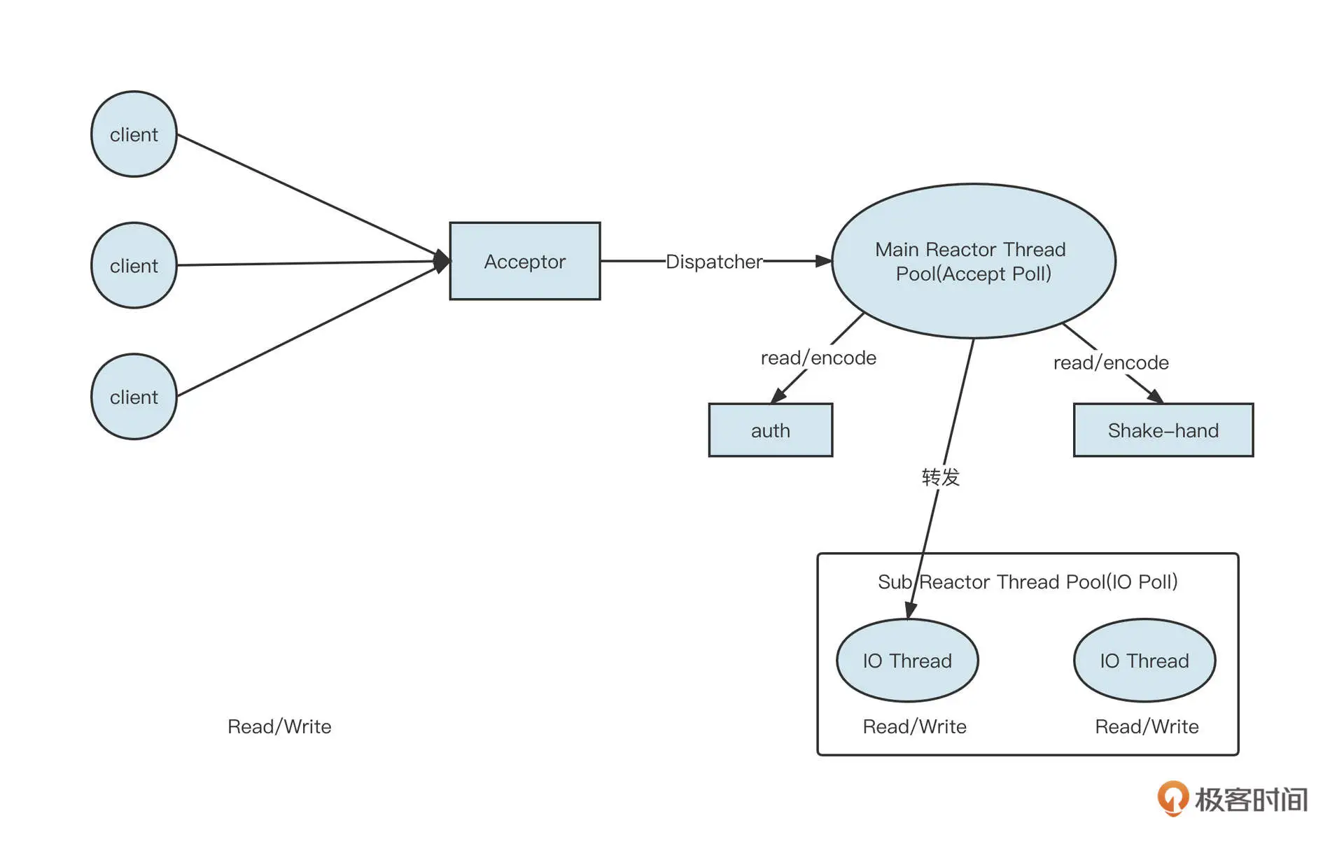 我们还了解了一个业内非常经典的线程模型:主从多 Reactor 模型。它的核心设计理念是让线程分工明确,相互协作。Main Reactor 线程池主要负责连接建立,SubReactor 线程池主要负责网络的读写,而编码、解码和业务执行则需要具体情况具体分析。