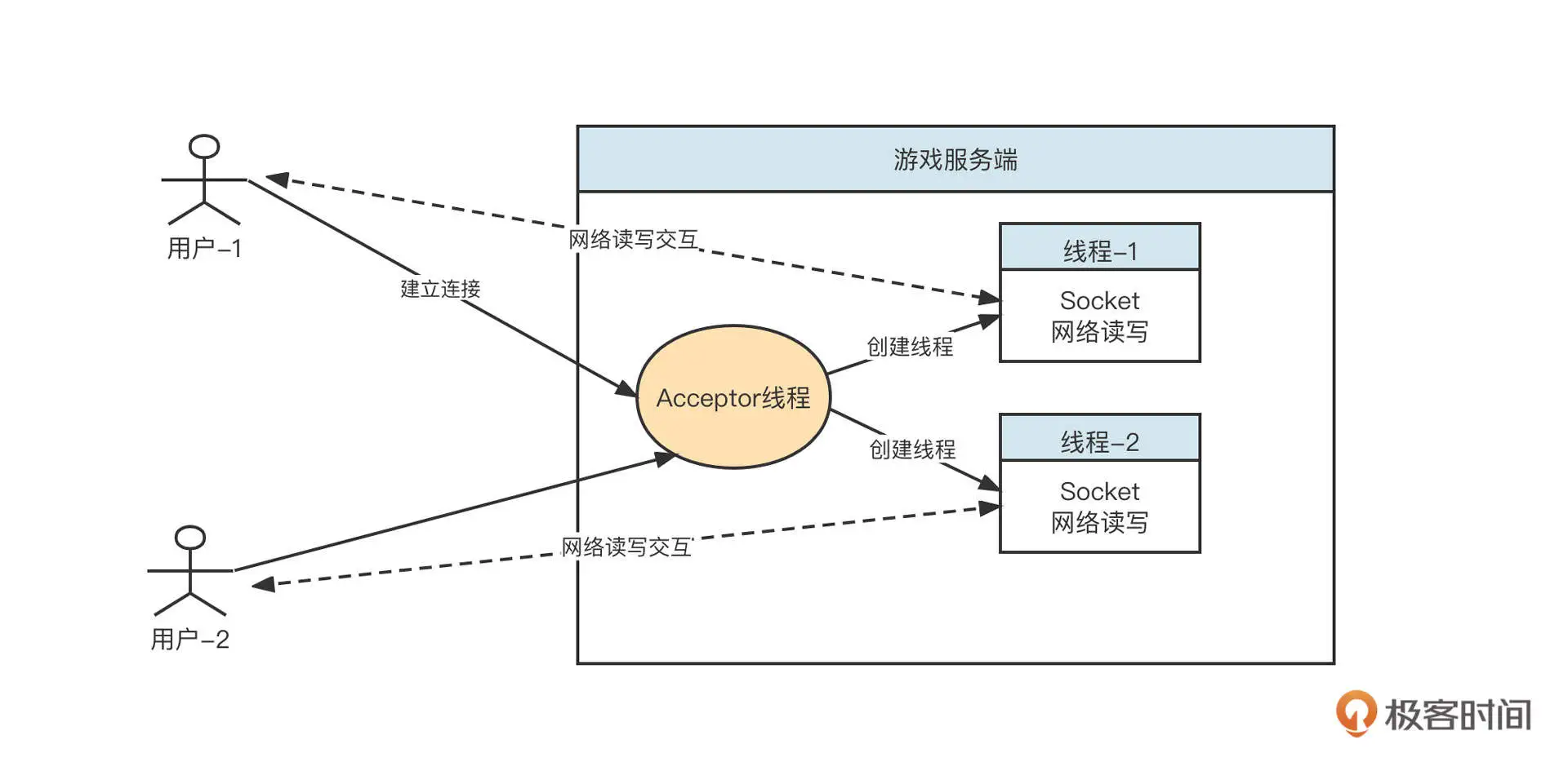 BIO 领域一种经典的设计范式是每个请求对应一个线程。我们就用这种思想设计一下游戏的服务端,设计图如下: