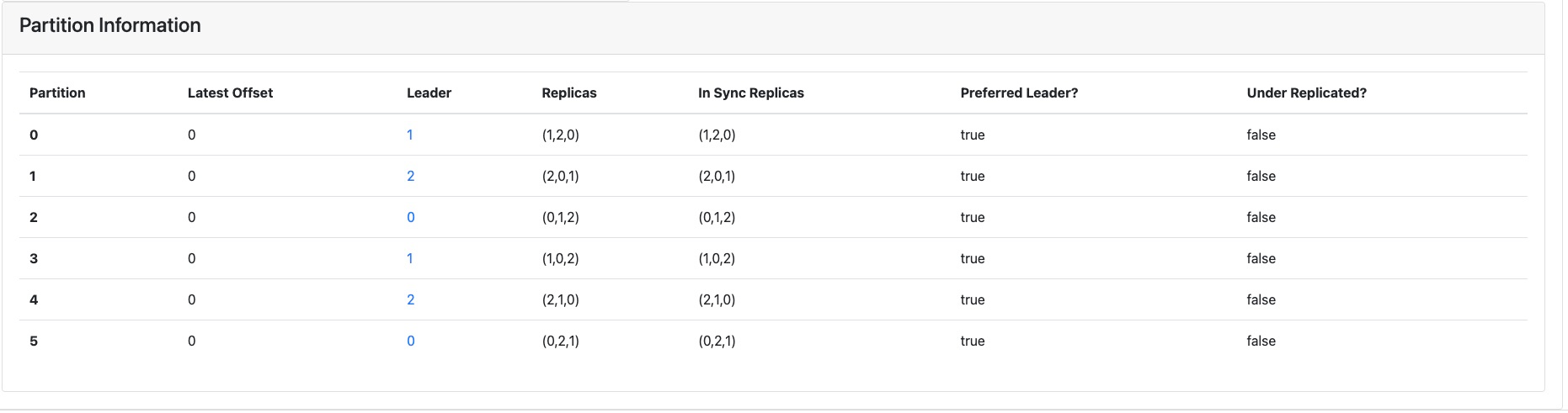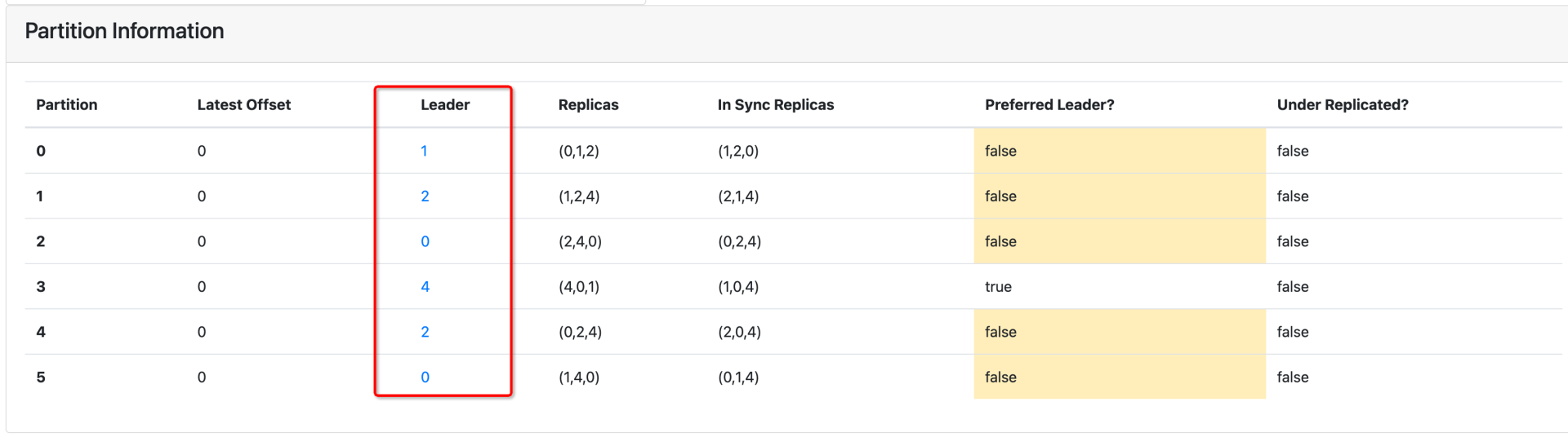 你可以重点关注一下 Leader 这一项,它表示分区所在的 Broker 节点。