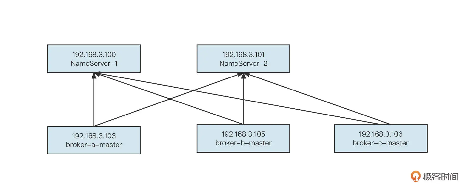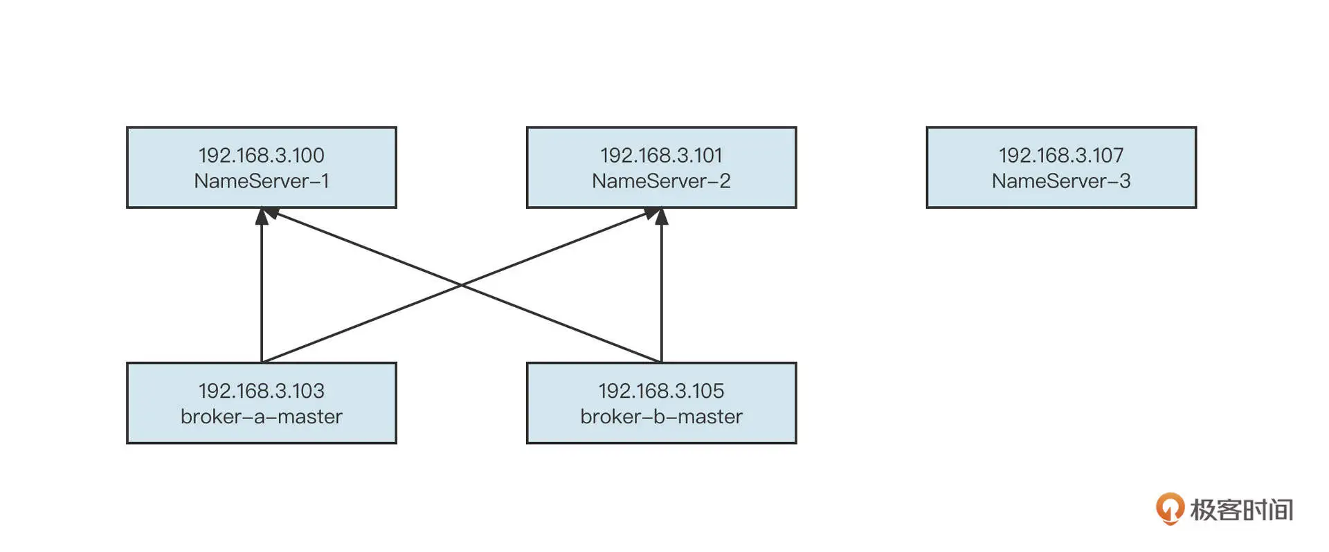 在生产实践中,NameServer 的扩容还是比较少见的,更多的是更换机器。举个例子,192.168.3.100 这台机器由于内存、磁盘等故障,需要被下线。但为了保证 NameServer 节点数量不受影响,我们通常还会在一台新机器上部署一台新的 NameServer。同时,为了避免客户端或 Broker 需要更新 NameServer 列表,更换机器时还要 IP 保持不变。