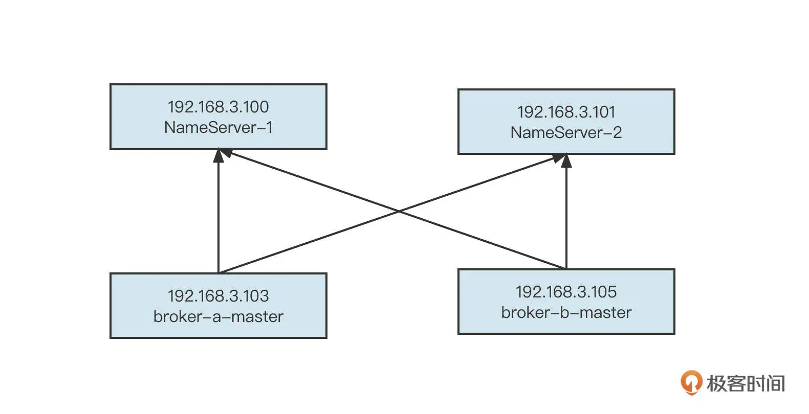 先说 RocketMQ。例如现在已经有一个两主的集群了,部署如下图所示: