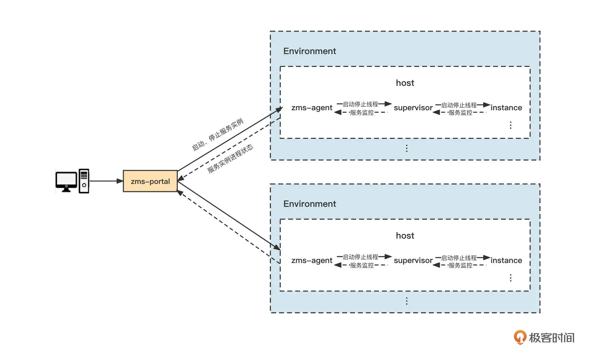 zms-agent(ZMS 代理)是 zms-portal 与主机中的服务实例进行交互的桥梁。它可以实现服务实例的启动、停止和重启操作,还能够监控服务实例进程状态。