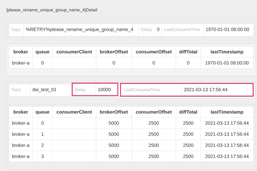 在开源版本的控制台 rocketmq-console 界面中,我们可以查阅消费端的这两个指标: