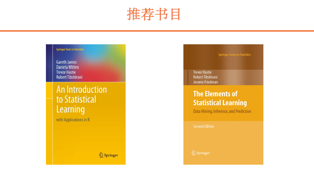两本书的作者是同一拨人,有两个共同的作者。它们讲述的都是统计学习,或者机器学习的方法。其中前一本可以看成是后一本的简化版。它更通俗、更简单一些,后面这个稍微有些难。为什么推荐这两本呢?因为这两本,它会更深入地挖掘方法背后的一些数学含义。我们能够看到的教科书,它主要的作用是把这个方法讲清楚。来了个方法,比如说线性回归,怎么推导,怎么区算,一大堆公式写出来,那么给出一个推导的结果,或者说决策树,或者其他的算法都一样,可能到这里就结束了,我的任务就完成了。