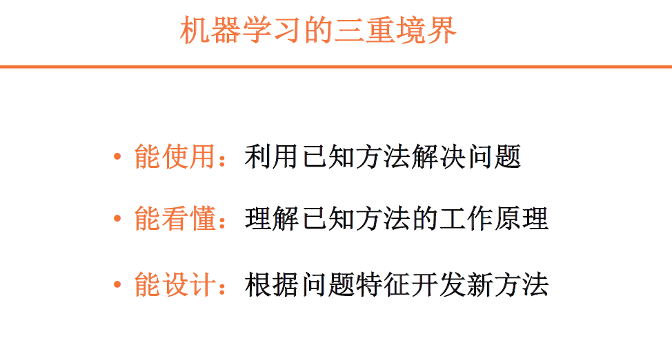 如果在能使用的基础上再进一步,那么就是能看懂,我不光用这个已知的方法来解决问题,同时我还能够理解这个方法的工作原理。知其然,还能知其所以然。能使用就是知其然,能看懂就是知其所以然。那么这个方法可能背后有一些数学推导,会涉及到一些概率,最优化,还有线性代数的一些使用。那么这个能看懂,就要求你具备相关的知识,能够把这个推导的过程给它顺下来,知道这个方法具体是怎么来工作。