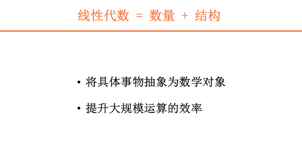 总结一下,线性代数,它就等于数量和结构的组合。它的作用,一方面可以把具体的事物抽象成数学对象,另外一方面,可以提升大规模运算的效率。