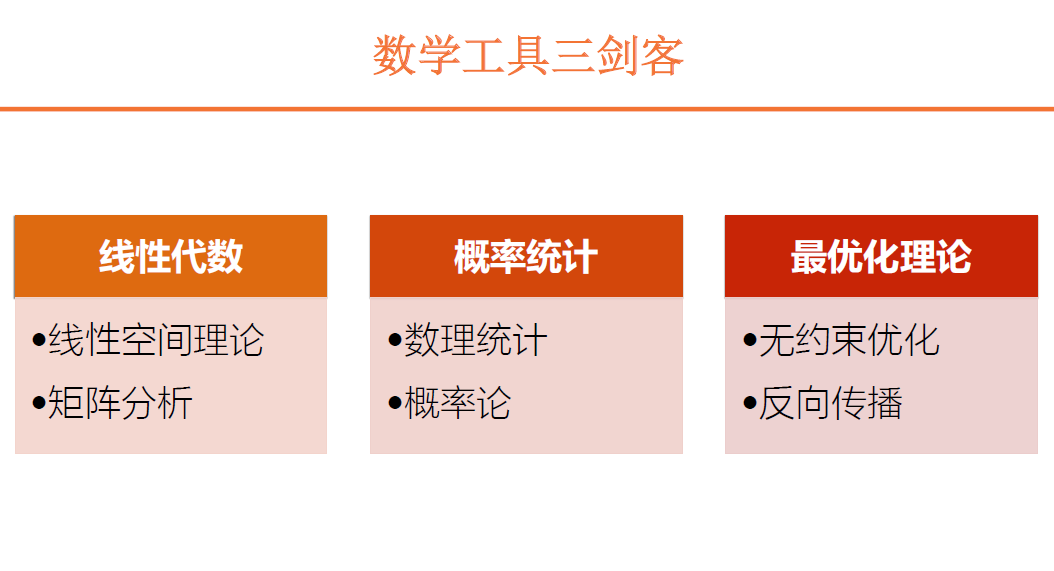 在这方面,我给出的建议是,一方面是,我们要握核心概念,在线性代数当中核心概念是什么?就是线性空间,向量矩阵以及对于向量矩阵的度量,包括范数、包括内积这些,这些就是它的核心概念。那么在概率统计当中,频率学派,还有贝叶斯学派,他们两者之间的区别是一个核心概念,同时呢,像期望方差这些指标,还有条件概率,这样的一些概念,条件概率联合概率这样一些概念也是核心概念。那么在最优化当中,这些算法,这个梯度下降法,或者牛顿法,这就是核心概念。