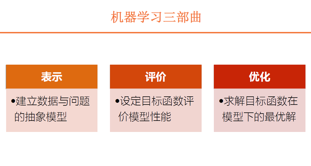 所以说,多明戈斯教授总结到的机器学习的三个步骤,包括了表示、评价、优化这样三个步骤,在这三个步骤当中我们会用到不同的数学公式来分别解决这三个问题。