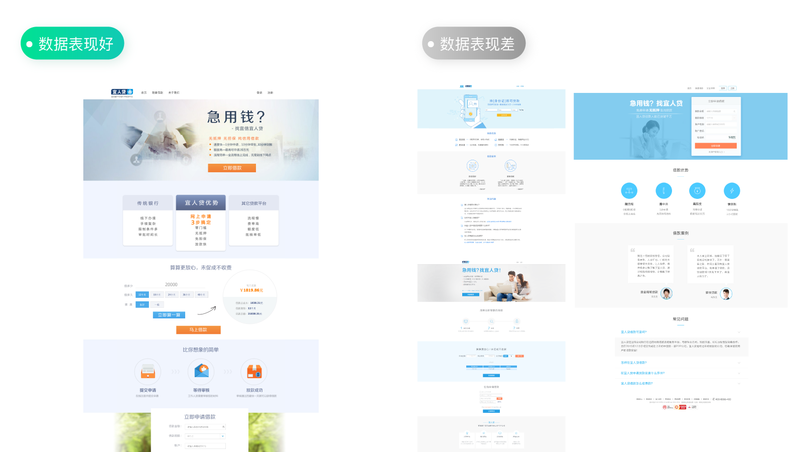 在我刚进入宜人贷时,我们的设计师做了很多努力,试图提升宜人贷营销落地页面的转化,但是效果都不好。反倒是其他团队设计出的一个看起来有些“土气”的页面效果最好。这就让我们的设计师很是想不通。为什么“漂亮”“美观”的页面数据不好,不好看的反而效果好呢?