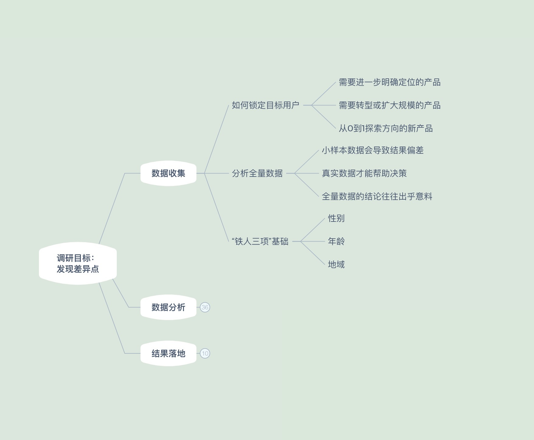 有关用户调研这一部分的知识很多,我以自己讲到的内容为主线画了一张“用户调研知识地图”。