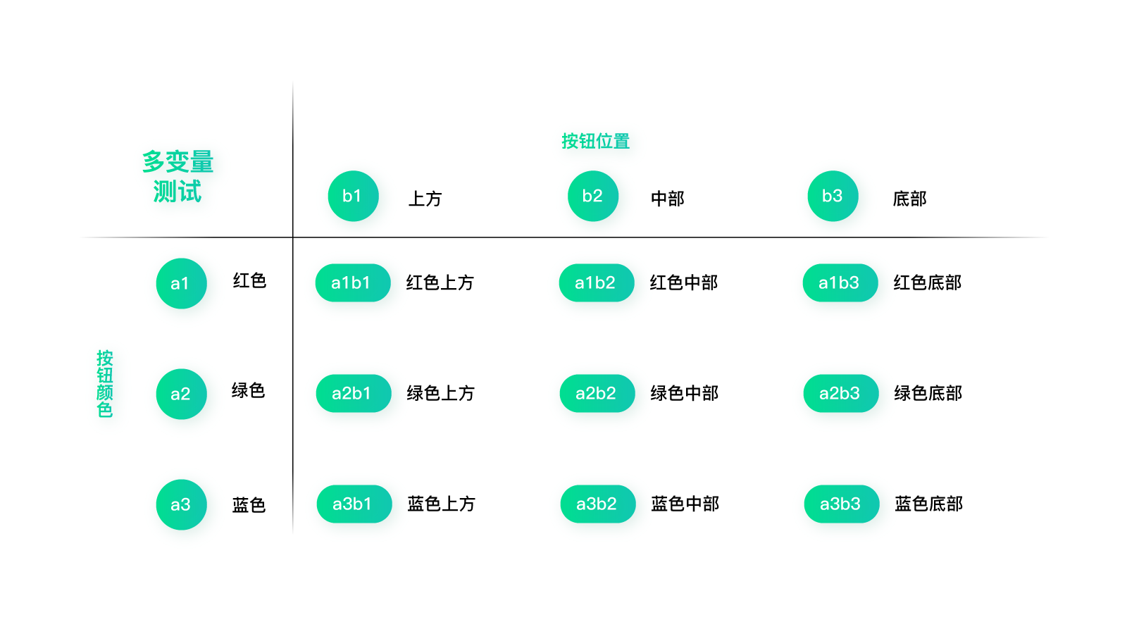 在每个变量下面,我们还需要再细分测试变量。比如按钮颜色,可以分解出a1红色;a2绿色;a3蓝色……按钮位置,可以分解出b1上方;b2中部;b3底部……按钮形状,可以分解出c1直角;c2圆角……