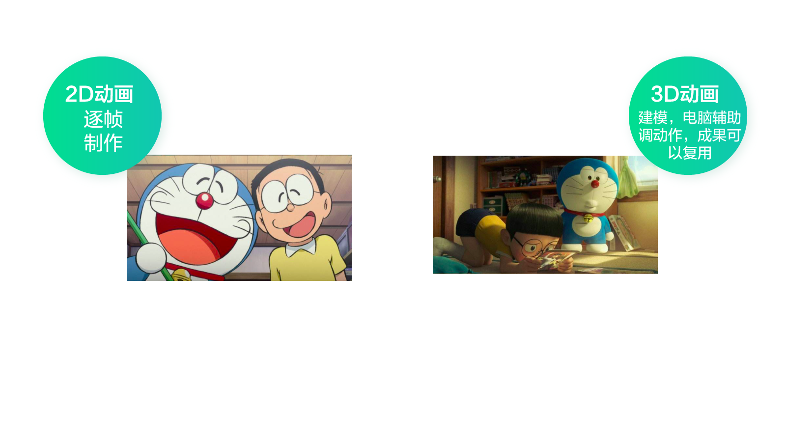2D动画和3D动画在实现上是完全不同的:2D动画需要逐帧制作,但3D动画是通过建模再用电脑辅助调整动作,所以模型可以被反复使用,效率很高,也便于展现人物及场景细节。