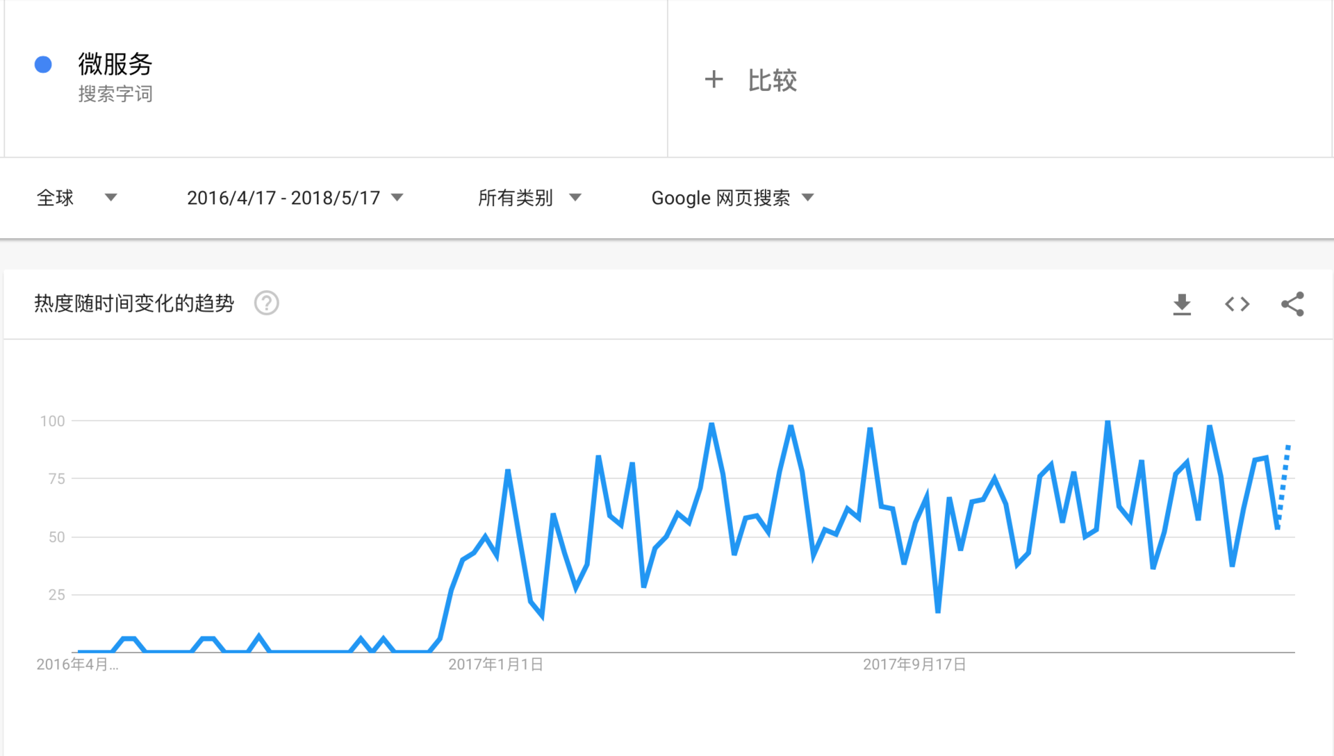 从谷歌的搜索指数来看,微服务的热度在进入2017年后突然爆发,国内各大会议和论坛的相关讨论也如雨后春笋般层出不穷,各大一线互联网公司也纷纷将这一技术引入并在实际业务中落地。