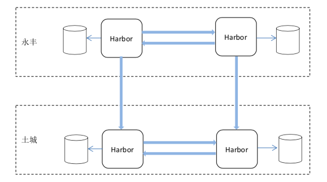既然Docker镜像是Docker容器运行的基础,那么镜像仓库的高可用性就不言而喻了。一般而言,高可用性设计无非就是把服务部署在多个IDC,这样的话即使有IDC出问题,也可以把服务迁移到别的正常IDC中去。同样对于镜像仓库的搭建,也可以采用多IDC部署,那么需要做到的就是不同IDC之间的镜像同步。以微博的镜像仓库为例,就像下图所描述的那样,镜像仓库会部署在永丰、土城两个内网IDC内,两个IDC内的镜像同步采用Harbor的双主复制策略,互相复制镜像,这样的话即使有一个IDC出现问题,另外一个IDC仍然能够提供服务,而且不丢失数据。