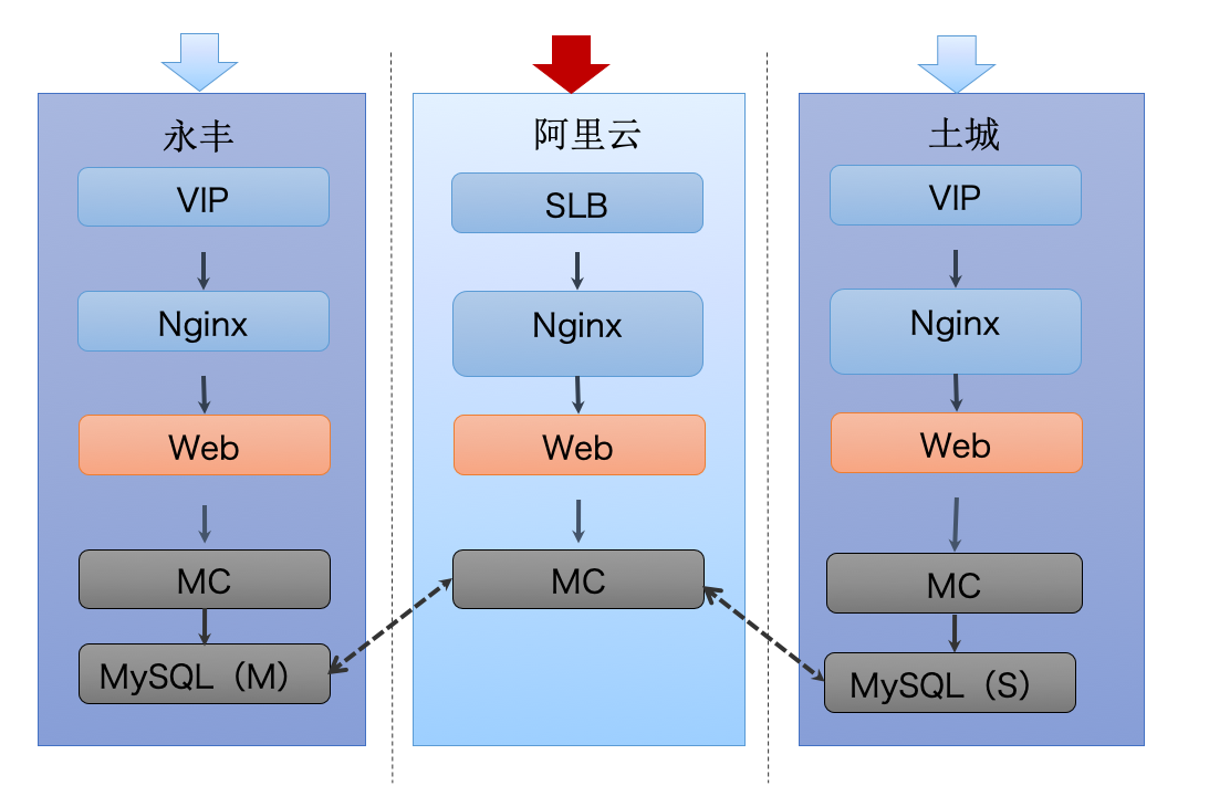 当有流量上涨,超出了内部私有云机房部署所能承受的范围时,可以扩容阿里云机房的机器,然后把流量切换到阿里云机房,这个过程请看下面这张图。切流量也有两种方案:一是在DNS层切换,把原先解析到私有云机房VIP的流量,解析到阿里云机房的SLB,这时候阿里云机房部署的SLB、Nginx和Java Web都需要扩容;一种是在Nginx层切换,把原先转发到私有云机房Nginx的流量,转发到阿里云机房的Java Web,这个时候只需要扩容阿里云的Java Web。