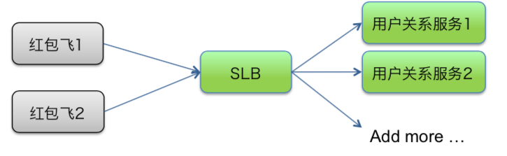 在[第28期]我讲过DCP的服务发现主要有两种方式,一种是针对HTTP服务采用的nginx-upsync-module,一种是针对RPC服务的Config Service。除此之外,阿里云上部署的服务还可以直接使用SLB来做服务发现。比如下面这张图,红包飞依赖了用户关系服务,当阿里云上用户关系服务扩容后,可以直接添加容器的IP到SLB下,这样红包飞服务访问SLB就可以获得最新的用户关系服务的节点列表。