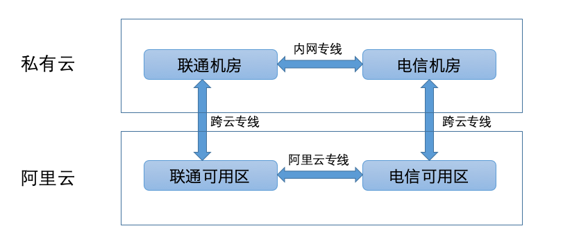 我们今天要聊的混合云部署,就是既在企业内部的私有云部署服务,又使用企业外部公有云部署服务的模式。和多机房一样,混合云部署同样要考虑几个关键的问题。