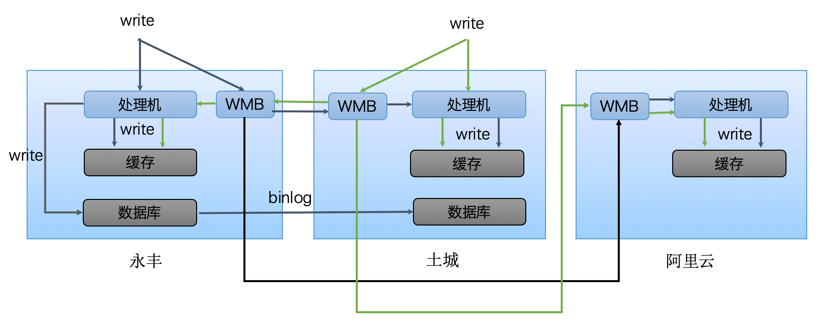 综合上面两点考虑,微博在做跨云数据同步的时候,把内部的永丰机房和土城机房的写消息通过WMB同步给阿里云机房的WMB,阿里云机房的WMB把写消息转发给阿里云机房的处理机处理,进而更新阿里云机房的缓存,整个流程可见下图。其中阿里云机房主要用于承担下行的读请求,部署的缓存也不是跟内网机房完全一致,而是只部署了最核心的服务所依赖的缓存,这样可以将大部分阿里云机房的请求都在内部消化,减少到内网数据库的穿透,从而节省跨云专线的带宽使用。
