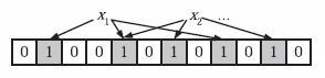 来看下面这张图,假设x1和x2存在,就把x1和x2通过Hash后找到的三个位置都设置成1。