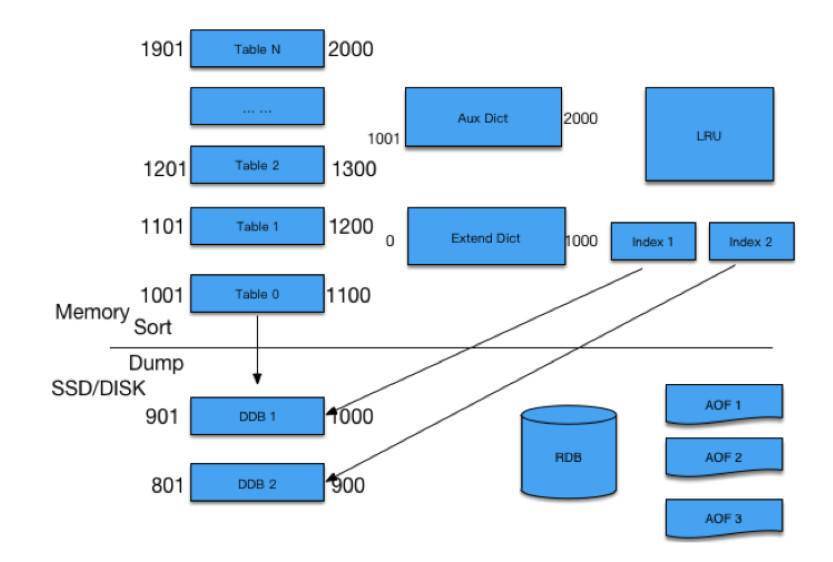 你可以看下面的示意图,CounterService的存储结构上面是内存下面是SSD,预先把内存分成N个Table,每个Table根据微博ID的指针序列,划出一定范围。任何一个微博ID过来先找到它所在的Table,如果有的话,直接对它进行增减;如果没有,就新增加一个Key。有新的微博ID过来,发现内存不够的时候,就会把最小的Table dump到SSD里面去,留着新的位置放在最上面供新的微博ID来使用。如果某一条微博特别热,转发、评论或者赞计数超过了4个字节,计数变得很大该怎么处理呢?对于超过限制的,我们把它放在Aux Dict进行存放,对于落在SSD里面的Table,我们有专门的Index进行访问,通过RDB方式进行复制。